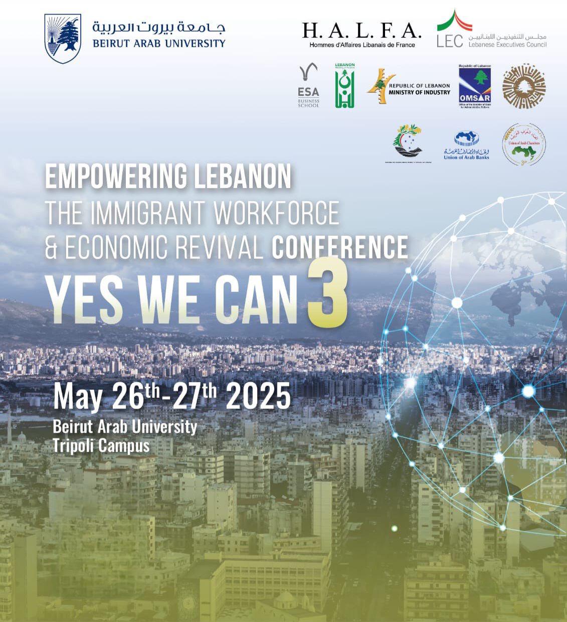 برعاية رئيس مجلس الوزراء الدكتور نواف سلام ، تستعد جامعة بيروت العربية – فرع طرابلس لاستضافة النسخة الثالثة من مؤتمر نعم قادرون تحت عنوان “تمكين لبنان: دور المغتربين في النهضة الاقتصادية”، الذي ينظمه تجمع رجال الأعمال اللبنانيين – الفرنسيين في فرنسا (HALFA) بالتعاون مع جامعة بيروت العربية، مجلس التنفيذيين اللبنانيين (LEC)، المجلس الاغترابي للأعمال( (LIBC ، ESA business school، اتحاد الغرف العربية، وزارة الصناعة اللبنانية، وزارة الدولة لشؤون التنمية الإدارية، اتحاد المصارف العربية، وزارة الاقتصاد والتجارة، غرفة التجارة والصناعة والزراعة في طرابلس ولبنان الشمالي، غرفة التجارة والصناعة في أستراليا ولبنان ونيوزيلندا، وذلك يومي 26 و27 أيار/مايو 2025،